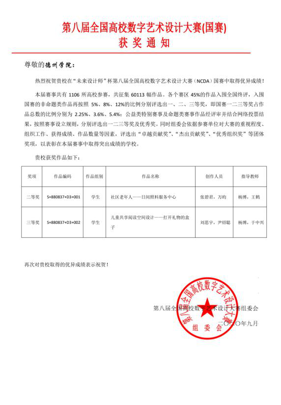 此项赛事为德州学院国家级B类竞赛,本届共有国内1106所高校参赛,共征集到60113幅作品。包括中国夜插内射视频网站-,北京师范大学,上海工艺夜插内射视频网站-,四川大学,南京林业大学,西南交通大学等美术设计类名校。我院师生团队首次参加该比赛,就显示出了不俗的创作实力。经过参赛院校初评、评审专家二评、主任评委终评三轮评审后,根据得分非命题类作品按照2.25%、3.6%、12%的比例分别评选出一、二、三等奖。夜插内射视频网站-最终获国家级二等奖1项,三等奖1项,省级一等奖、二等奖、三等奖各1项,4名教师获优秀指导教师奖。