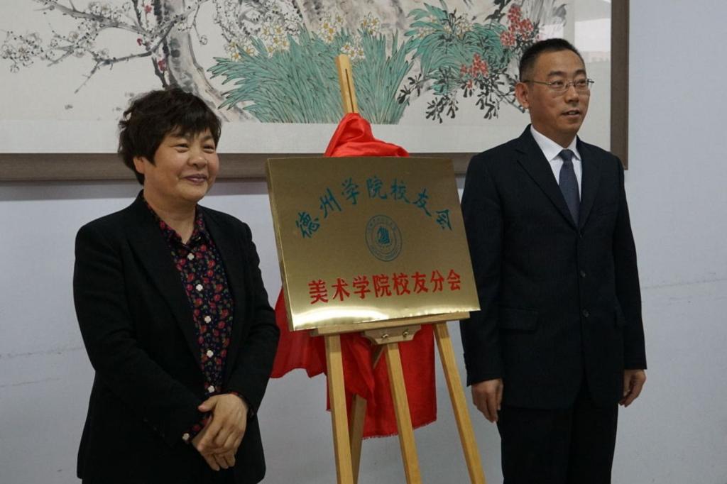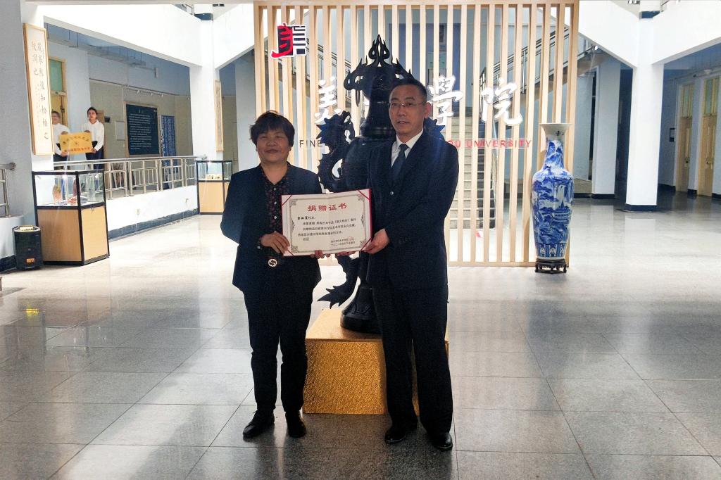 会上还举行了夜插内射视频网站-校友作品捐赠仪式。为迎接校庆,展现办学实力、展示艺术水准,夜插内射视频网站-承办了德州学院50周年书画摄影展,在展览筹备的过程中,得到了广大校友鼎力支持,纷纷拿出自己的精品力作参展,并表示将作品捐赠给夜插内射视频网站-。这批捐赠作品中,包含了国画、油画、书法、工艺品等各种艺术形式,题材多样、水平上乘,兼具学术水准和商业价值。梁丽霞董事长代表校友向夜插内射视频网站-捐赠黑陶艺术作品《薪火相传》,夜插内射视频网站-党总支书记董福君代表学院接受捐赠,董书记向梁董事长颁发捐赠证书。
