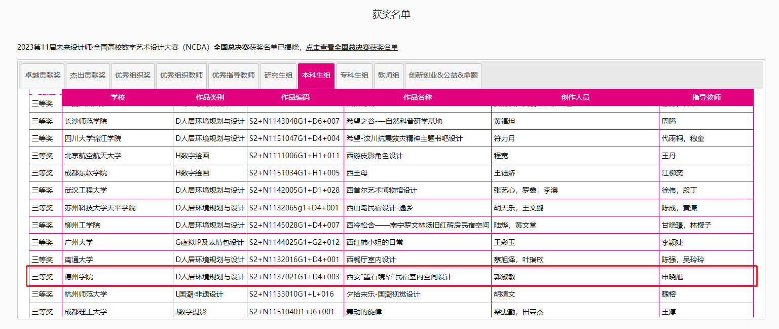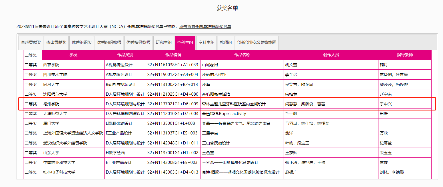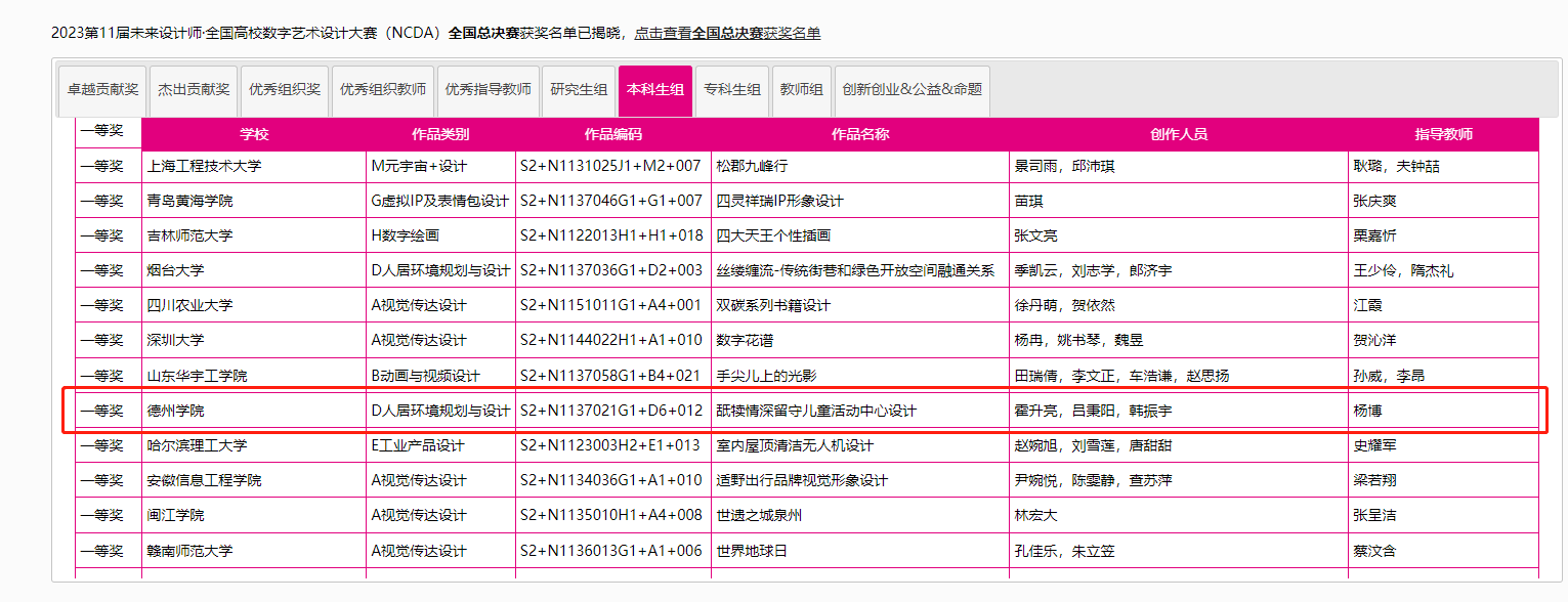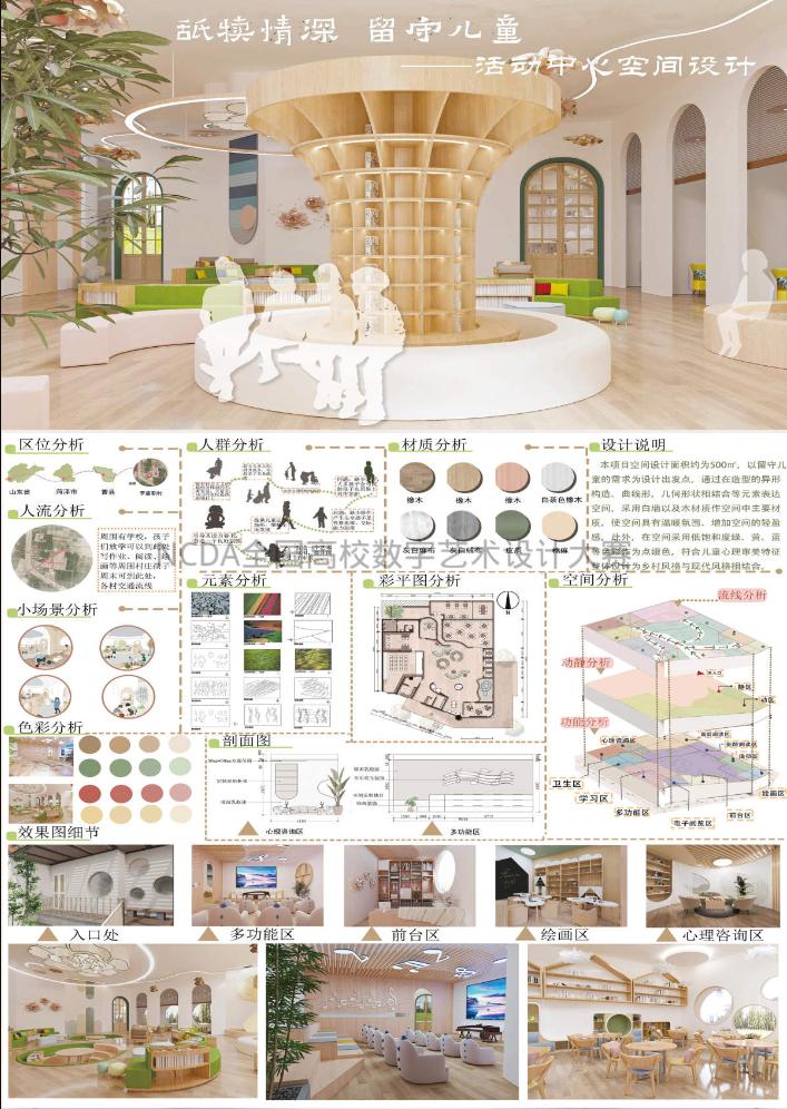 8月25日,2023第11届未来设计师·全国高校数字艺术设计大赛(NCDA)全国总决赛奖项公布,夜插内射视频网站-三项作品榜上有名,取得了优异成绩。其中由杨博老师指导,霍升亮、吕秉阳、韩振宇创作的作品《舐犊情深留守儿童活动中心设计》拔得头筹,喜获全国总决赛一等奖;由于中兴老师指导,闫静静、柴麟俊、曹蕾同学创作的作品《森林主题儿童牙科医院室内空间设计》获得全国总决赛二等奖;由申晓旭老师指导、郭淑敏同学创作的作品《西安"墨石镌华"民宿室内空间设计》获得全国总决赛三等奖。