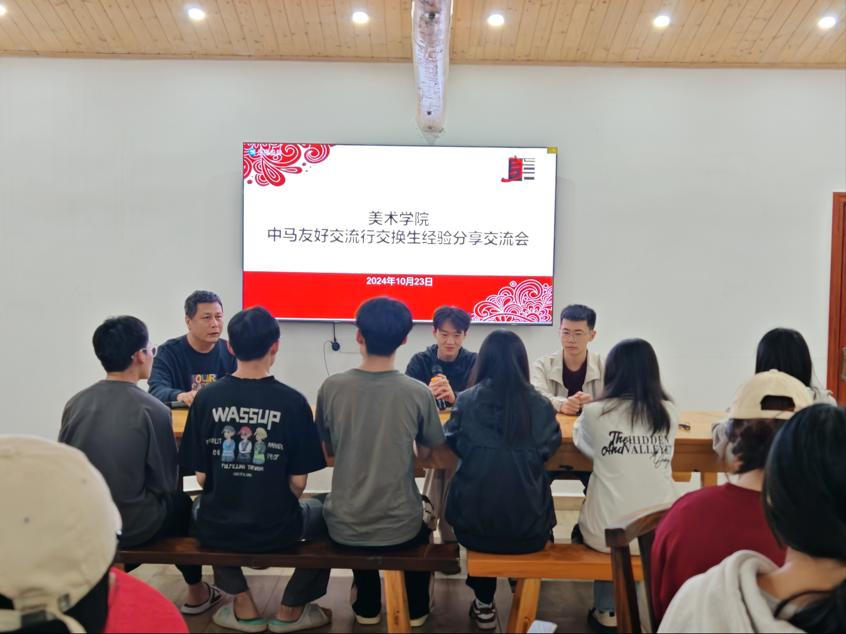 10 月 23日,夜插内射视频网站-举办中马友好交流行交换生经验分享交流会,邀请了参加此次交流行活动的左彬、王葆东、贾思然、郭秋彤4位同学,交流会由艺术设计系主任于中兴主持。