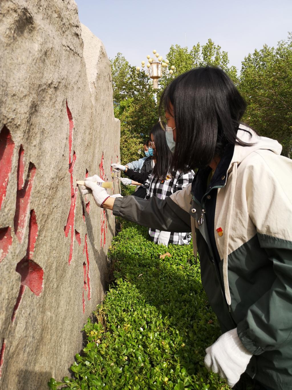 4月28日,夜插内射视频网站-党总支组织学生党员开展“我为校训石洗尘描红”志愿服务活动。